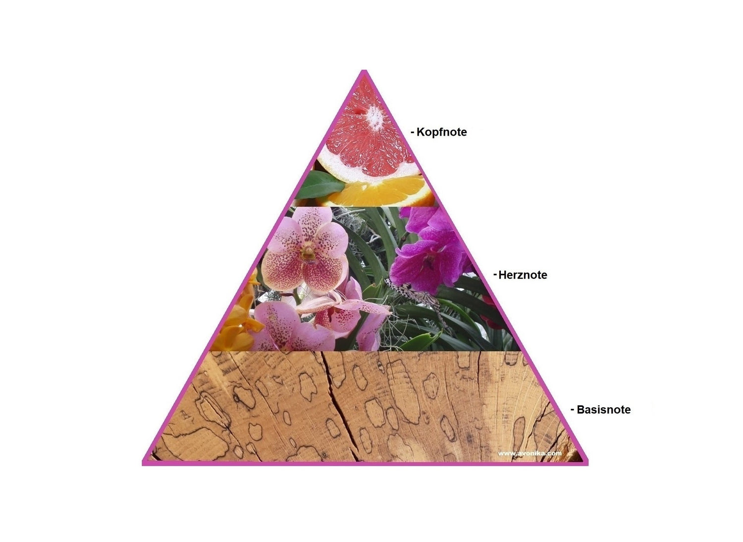 Der Geruch eines Parfüms durchläuft nach dem Versprühen verschiedene Phasen, in denen sich die Bestandteile unterschiedlich schnell auflösen. Durch die Darstellung dieser Duft-Pyramide können die Gerüche in drei verschiedene Kategorien unterteilt werden. Die definierten Kopfnoten, die Herznoten und die Basisnoten .